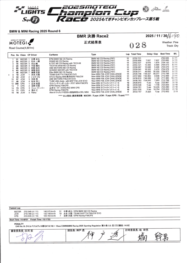 考察:このRace 11で#55 石井は必要十分なポイントを確保し、M2 CS Racingクラスのドライバーズおよびチームタイトルを獲得(シーズンチャンピオン確定)。#31 中澤は富士に続き連勝を重ね、勢いは止まらない。JCWでは#19 井本がさらに勝ちを重ね、CPSでは#358 辻本が連勝を継続している。